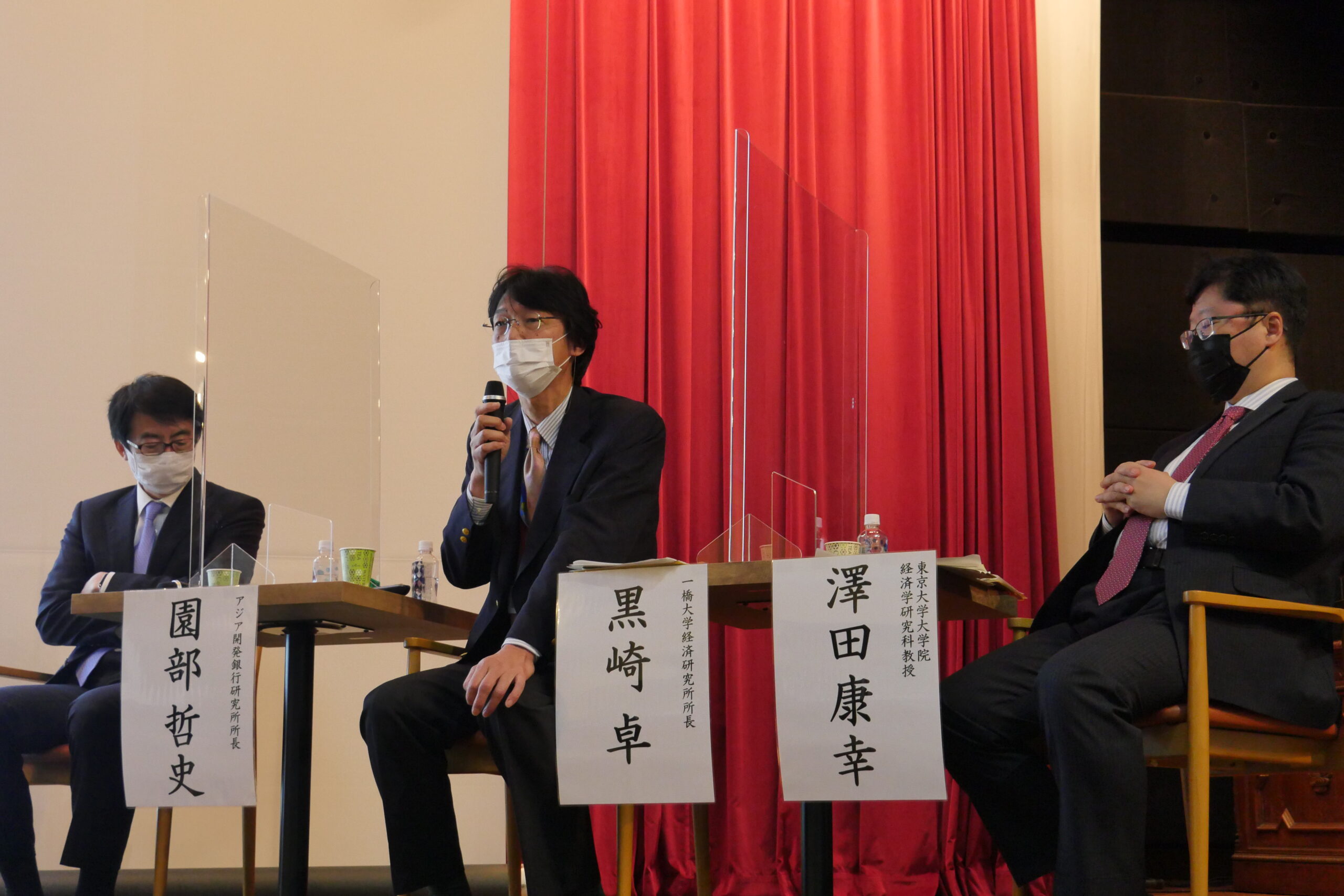 休憩をはさみ行われたパネルディスカッションでは、橋野知子経済学研究科教授をモデレーターに、3名のパネリスト、園部哲史アジア開発銀行研究所所長(政策研究大学院大学前副学長)、黒崎卓一橋大学経済研究所所長、澤田康幸東京大学大学院経済学研究科教授(アジア開発銀行前チーフエコノミスト)が登壇し、大塚特命教授も議論に参加しました。先ず、基調講演について現地会場の参加者から寄せられた質問に対して大塚先生が答えることから始まり、会場は和やかな雰囲気に包まれました。その後、「私が考える開発経済学」をテーマに、大塚特命教授の開発経済学、開発経済学の最近の潮流や将来展望等について各人が持論を展開し議論を交わしました。結びには、橋野教授から、識者からのメッセージとして、菊池眞夫千葉大学名誉教授、廣木重之前駐スウェーデン大使、中尾武彦アジア開発銀行前総裁、武藤めぐみJICA上級審議役、そして斎藤修一橋大学名誉教授からの温かい祝意と激励の言葉が披露されました。