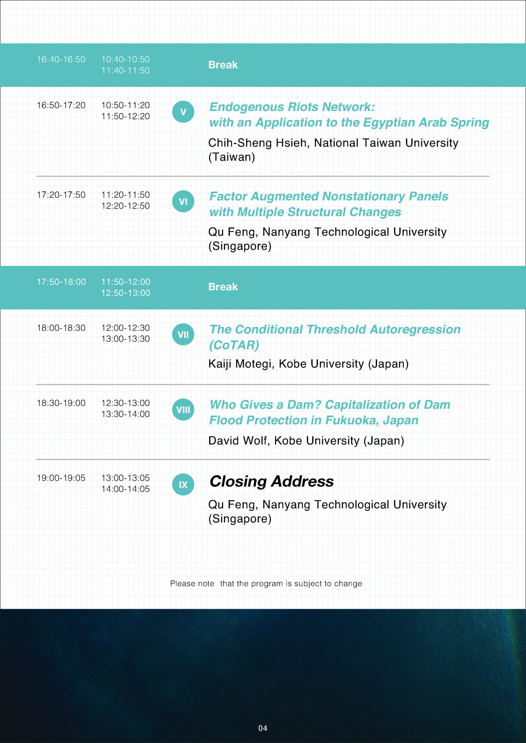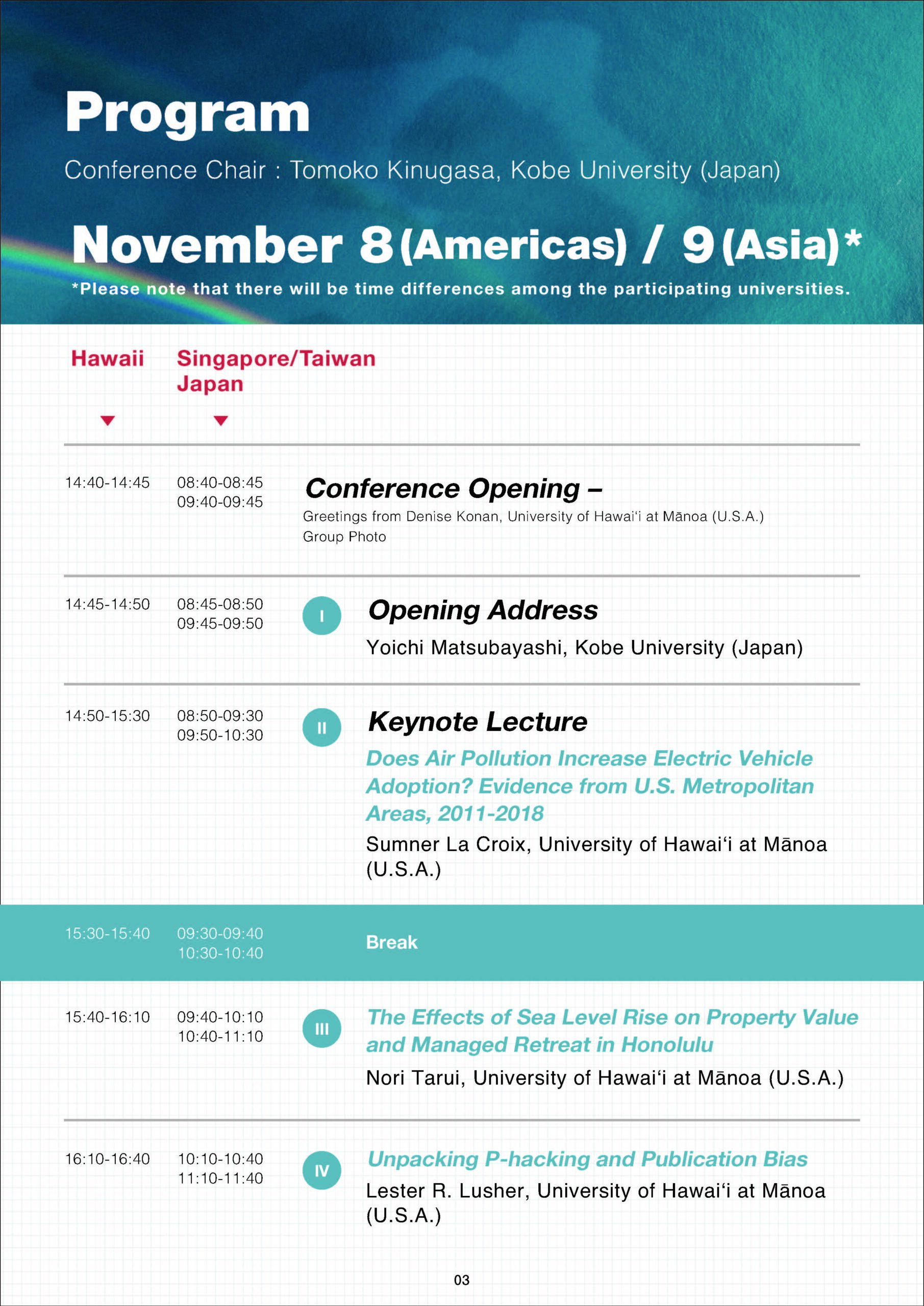 2021年11月9日、本学経済学研究科主催のThe 6th Annual International Conference on Applied Econometrics in Hawaii(第6回ハワイカンファレンス)が実施されました。ハワイカンファレンスは、環太平洋地域の有力大学に在籍する若手研究者に学術交流の場を提供し、国際共同研究の推進および研究力強化を図ることを目的に、経済学研究科の主要行事のひとつとして2015年より毎年開催されています。2020年度はコロナ禍により開催中止となりましたが、今回は初のリアルタイム・ウェビナーという形式で約5時間のオンライン・カンファレンスが実現しました。今回はハワイ大学マノア校、国立台湾大学、南洋理工大学(シンガポール)、本学経済学研究科の4校から気鋭の経済学者が集いました。