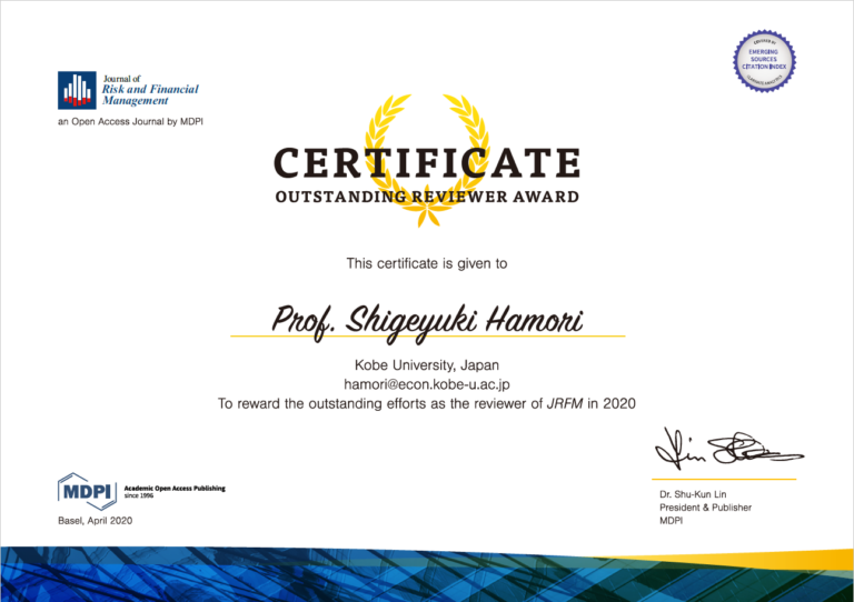 羽森茂之教授が「Journal of Risk and Financial Management」の「Outstanding Reviewer Award」を受賞しました。