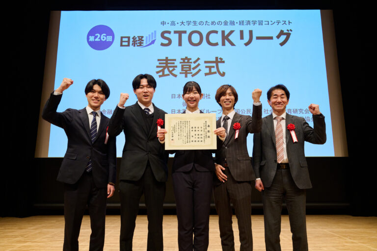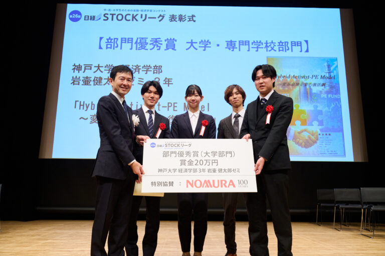 ニュース 本研究科の岩壷健太郎教授のゼミ生が「日経STOCKリーグ」で(大学部門)部門優秀賞を受賞しました。 2026/03/24 研究 昨年度に続いて2年連続の入賞です。 写真の左から岩田優明、藤井海、吉谷紗弥、齋藤勇斗、岩壷教授。